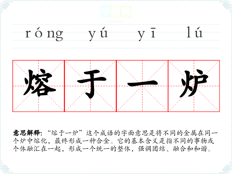 “熔于一炉”这个成语的字面意思是将不同的金属在同一个炉中熔化,最终形成一种合金。它的基本含义是指不同的事物或个体融汇在一起,形成一个统一的整体,强调团结、融合和和谐。