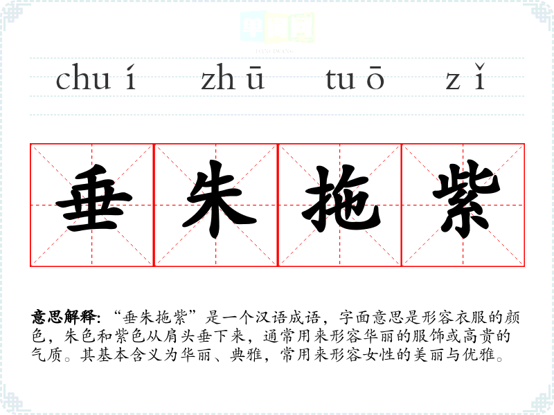 “垂朱拖紫”是一个汉语成语,字面意思是形容衣服的颜色,朱色和紫色从肩头垂下来,通常用来形容华丽的服饰或高贵的气质。其基本含义为华丽、典雅,常用来形容女性的美丽与优雅。