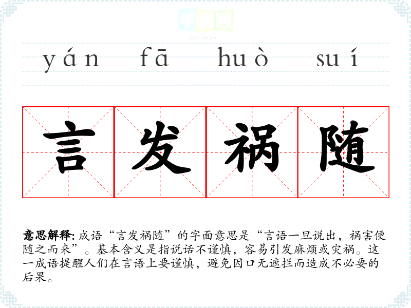 成语“言发祸随”的字面意思是“言语一旦说出,祸害便随之而来”。基本含义是指说话不谨慎,容易引发麻烦或灾祸。这一成语提醒人们在言语上要谨慎,避免因口无遮拦而造成不必要的后果。