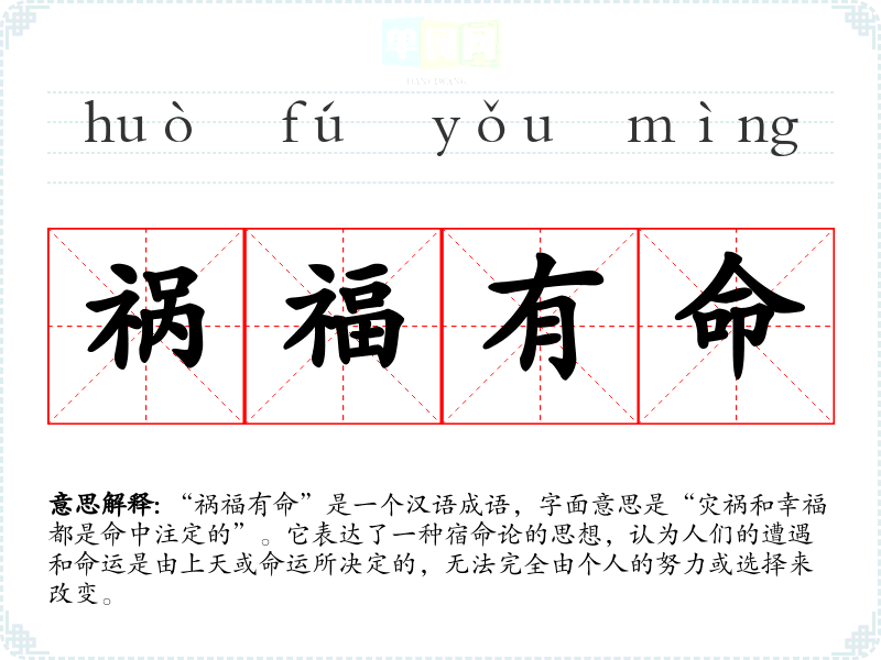 “祸福有命”是一个汉语成语,字面意思是“灾祸和幸福都是命中注定的”。它表达了一种宿命论的思想,认为人们的遭遇和命运是由上天或命运所决定的,无法完全由个人的努力或选择来改变。
