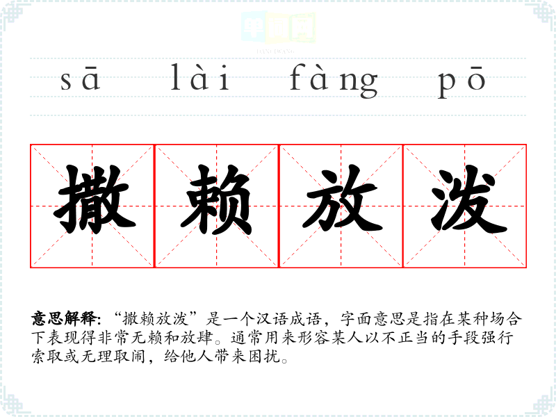 成语“撒赖放泼”并没有明确的历史典故或文学出处,但它的构成可以理解为对一种行为的描述。这里的“撒赖”意指无赖,指不讲道理、随意妄为的人;“放泼”则是形容一种放肆、不受约束的行为。成语的形成反映了社会对某些不道德行为的反感。