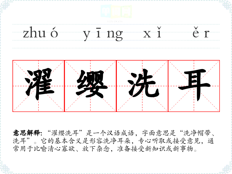 “濯缨洗耳”是一个汉语成语,字面意思是“洗净帽带、洗耳”。它的基本含义是形容洗净耳朵,专心听取或接受意见,通常用于比喻清心寡欲、放下杂念,准备接受新知识或新事物。