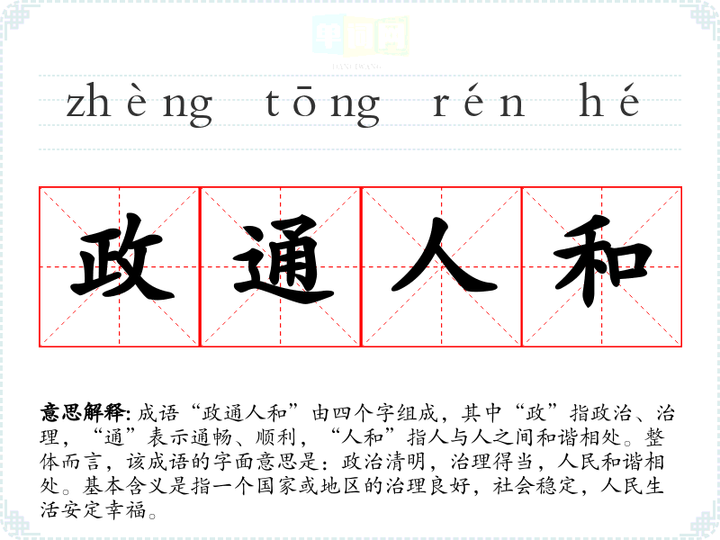 成语“政通人和”由四个字组成,其中“政”指政治、治理,“通”表示通畅、顺利,“人和”指人与人之间和谐相处。整体而言,该成语的字面意思是:政治清明,治理得当,人民和谐相处。基本含义是指一个国家或地区的治理良好,社会稳定,人民生活安定幸福。