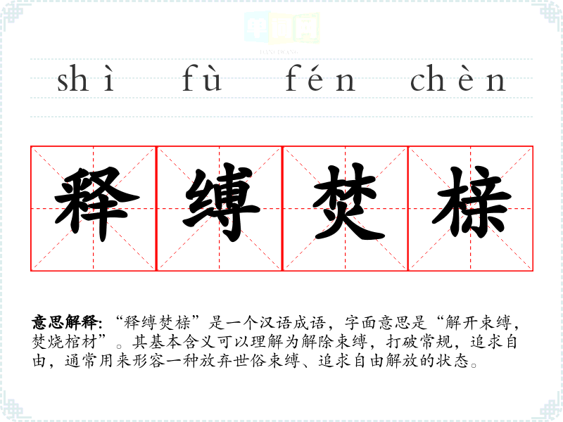 “释缚焚榇”是一个汉语成语,字面意思是“解开束缚,焚烧棺材”。其基本含义可以理解为解除束缚,打破常规,追求自由,通常用来形容一种放弃世俗束缚、追求自由解放的状态。