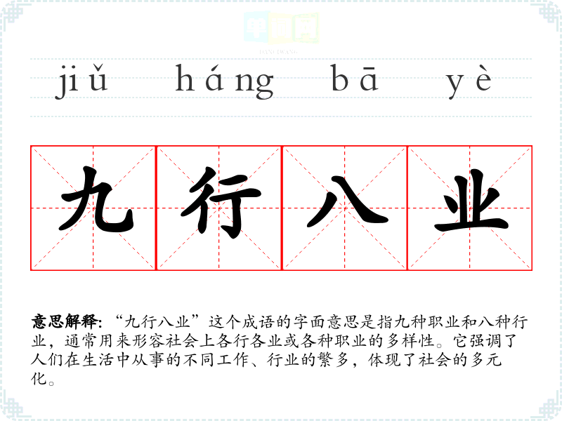 “九行八业”这个成语的字面意思是指九种职业和八种行业,通常用来形容社会上各行各业或各种职业的多样性。它强调了人们在生活中从事的不同工作、行业的繁多,体现了社会的多元化。