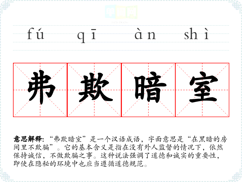 “弗欺暗室”是一个汉语成语,字面意思是“在黑暗的房间里不欺骗”。它的基本含义是指在没有外人监督的情况下,依然保持诚信,不做欺骗之事。这种说法强调了道德和诚实的重要性,即使在隐秘的环境中也应当遵循道德规范。