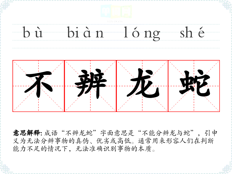 成语“不辨龙蛇”字面意思是“不能分辨龙与蛇”,引申义为无法分辨事物的真伪、优劣或高低。通常用来形容人们在判断能力不足的情况下,无法准确识别事物的本质。