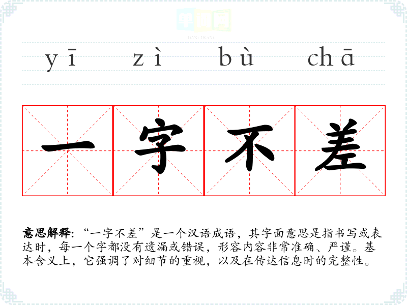 “一字不差”是一个汉语成语,其字面意思是指书写或表达时,每一个字都没有遗漏或错误,形容内容非常准确、严谨。基本含义上,它强调了对细节的重视,以及在传达信息时的完整性。