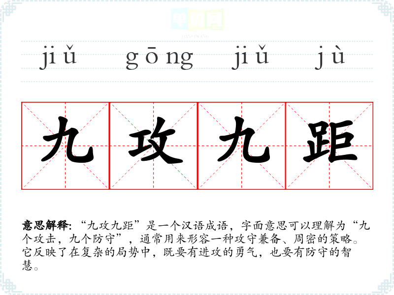 “九攻九距”是一个汉语成语,字面意思可以理解为“九个攻击,九个防守”,通常用来形容一种攻守兼备、周密的策略。它反映了在复杂的局势中,既要有进攻的勇气,也要有防守的智慧。