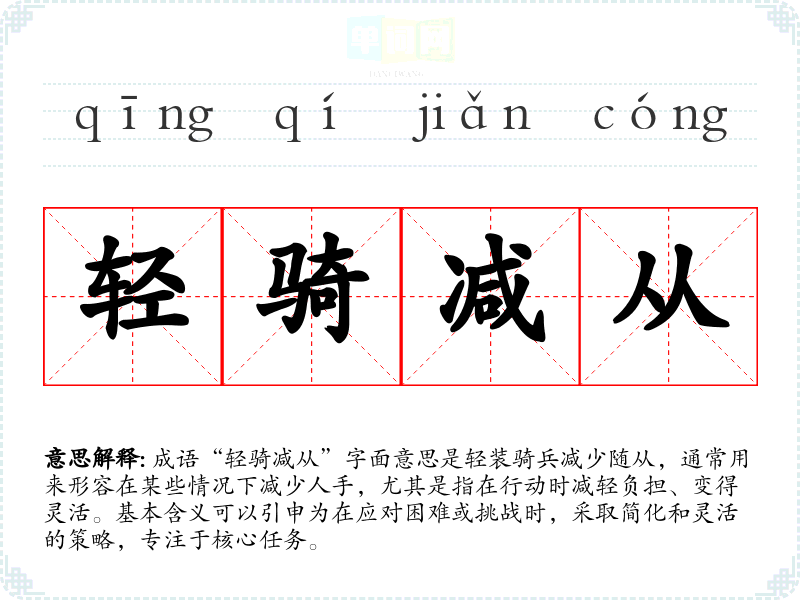 成语“轻骑减从”字面意思是轻装骑兵减少随从,通常用来形容在某些情况下减少人手,尤其是指在行动时减轻负担、变得灵活。基本含义可以引申为在应对困难或挑战时,采取简化和灵活的策略,专注于核心任务。