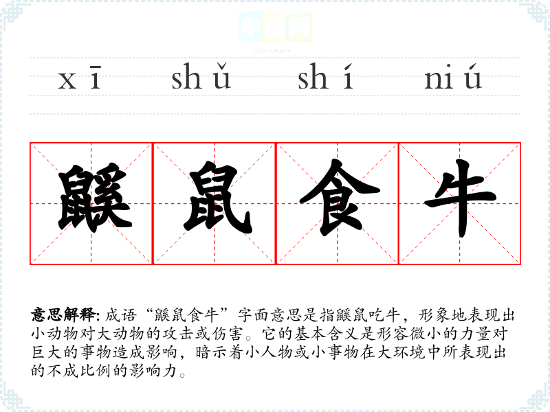 成语“鼷鼠食牛”字面意思是指鼷鼠吃牛,形象地表现出小动物对大动物的攻击或伤害。它的基本含义是形容微小的力量对巨大的事物造成影响,暗示着小人物或小事物在大环境中所表现出的不成比例的影响力。