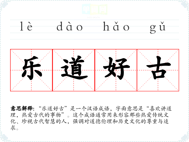 “乐道好古”是一个汉语成语,字面意思是“喜欢讲道理,热爱古代的事物”。这个成语通常用来形容那些热爱传统文化、珍视古代智慧的人,强调对道德伦理和历史文化的尊重与追求。