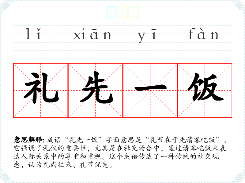 成语“礼先一饭”字面意思是“礼节在于先请客吃饭”。它强调了礼仪的重要性,尤其是在社交场合中,通过请客吃饭来表达人际关系中的尊重和重视。这个成语传达了一种传统的社交观念,认为礼尚往来、礼节优先。