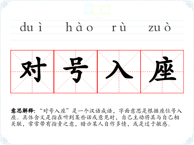 “对号入座”是一个汉语成语,字面意思是根据座位号入座。具体含义是指在听到某些话或意见时,自己主动将其与自己相关联,常常带有指责之意,暗示某人自作多情,或是过于敏感。