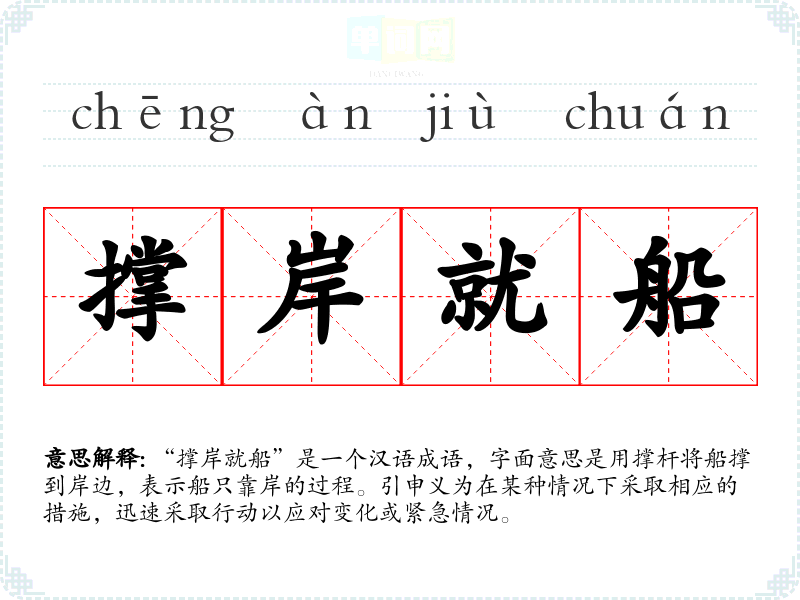 “撑岸就船”是一个汉语成语,字面意思是用撑杆将船撑到岸边,表示船只靠岸的过程。引申义为在某种情况下采取相应的措施,迅速采取行动以应对变化或紧急情况。