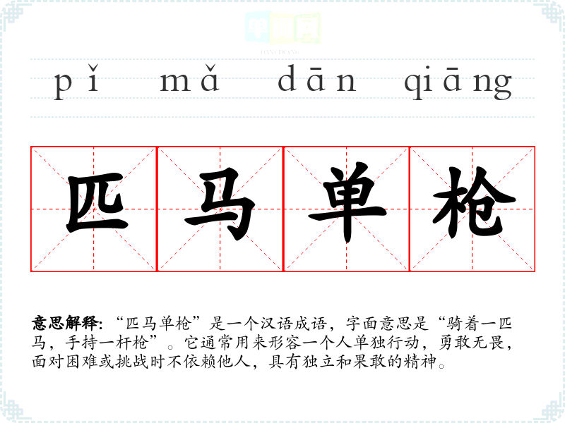 “匹马单枪”是一个汉语成语,字面意思是“骑着一匹马,手持一杆枪”。它通常用来形容一个人单独行动,勇敢无畏,面对困难或挑战时不依赖他人,具有独立和果敢的精神。