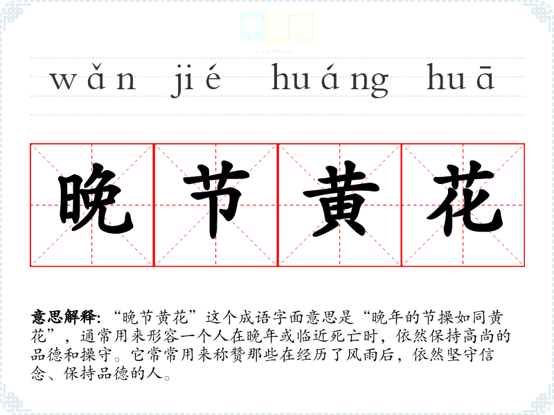 “晚节黄花”这个成语字面意思是“晚年的节操如同黄花”,通常用来形容一个人在晚年或临近死亡时,依然保持高尚的品德和操守。它常常用来称赞那些在经历了风雨后,依然坚守信念、保持品德的人。