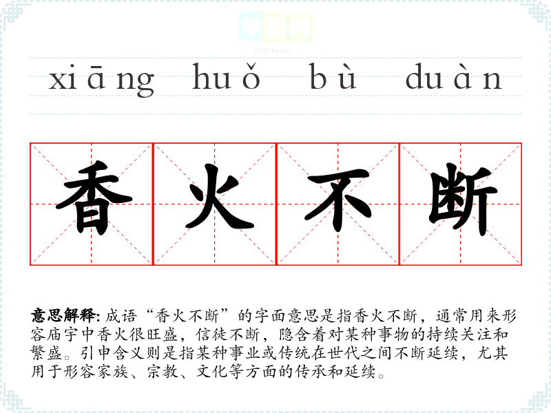 | 香火不断 | 信神者所供养的香烛永不断绝。 |