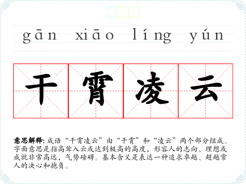 成语“干霄凌云”由“干霄”和“凌云”两个部分组成。字面意思是指高耸入云或达到极高的高度,形容人的志向、理想或成就非常高远,气势磅礴。基本含义是表达一种追求卓越、超越常人的决心和抱负。