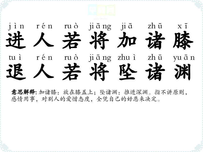 | 进人若将加诸膝,退人若将坠诸渊 | 加诸膝:放在膝盖上;坠诸渊:推进深渊。指不讲原则,感情用事,对别人的爱憎态度,全凭自己的好恶来决定。 |