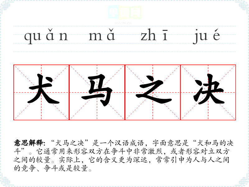 “犬马之决”是一个汉语成语,字面意思是“犬和马的决斗”。它通常用来形容双方在争斗中非常激烈,或者形容对立双方之间的较量。实际上,它的含义更为深远,常常引申为人与人之间的竞争、争斗或是较量。