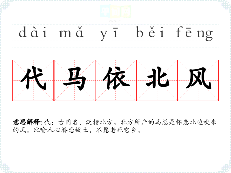 | 代马不思越 | 代:古国名,在今河北蔚县、山西东北部一带,泛指北方;越:古国名,泛指南方。北方所产的马不思念南方。比喻眷恋故土。 |