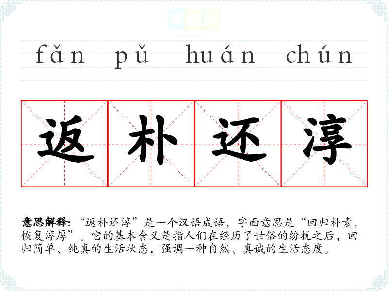 | 返朴还淳 | 返:返回,还。朴:朴实。淳:诚实,厚道。指恢复原始的诚实和朴实厚道的社会风气。 |