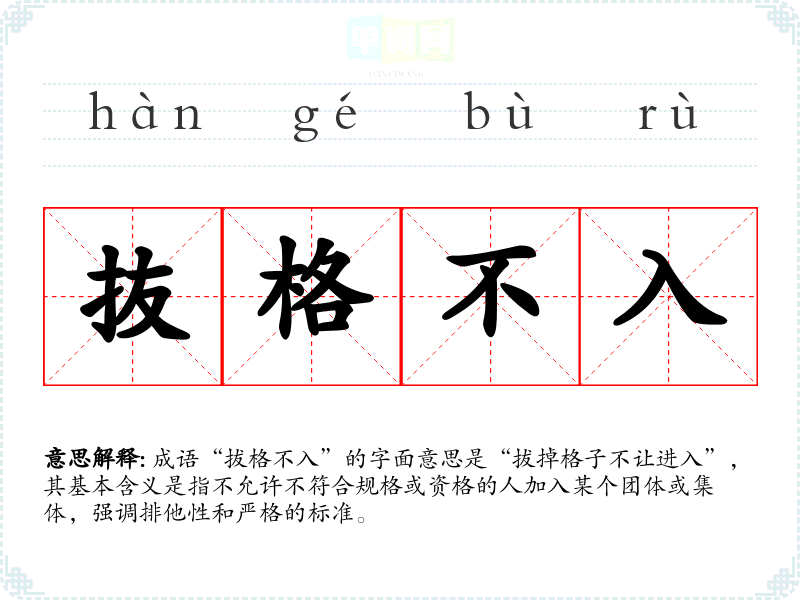 成语“拔格不入”的字面意思是“拔掉格子不让进入”,其基本含义是指不允许不符合规格或资格的人加入某个团体或集体,强调排他性和严格的标准。