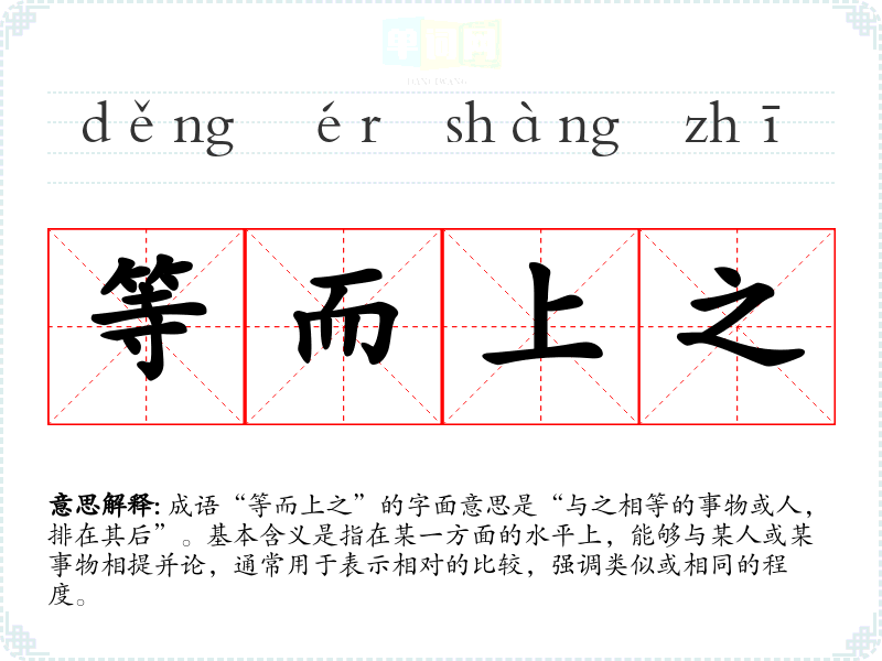 成语“等而上之”的字面意思是“与之相等的事物或人,排在其后”。基本含义是指在某一方面的水平上,能够与某人或某事物相提并论,通常用于表示相对的比较,强调类似或相同的程度。