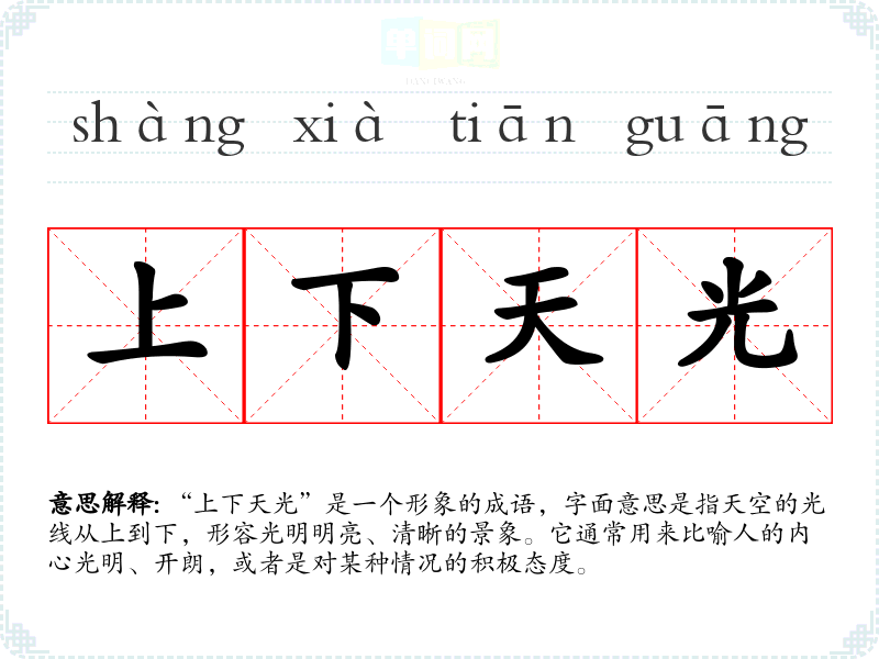 “上下天光”是一个形象的成语,字面意思是指天空的光线从上到下,形容光明明亮、清晰的景象。它通常用来比喻人的内心光明、开朗,或者是对某种情况的积极态度。