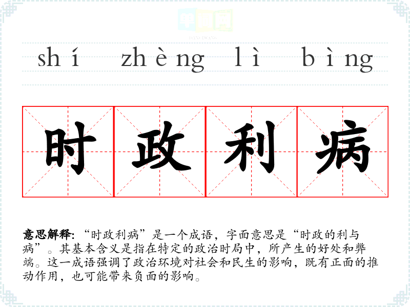 “时政利病”是一个成语,字面意思是“时政的利与病”。其基本含义是指在特定的政治时局中,所产生的好处和弊端。这一成语强调了政治环境对社会和民生的影响,既有正面的推动作用,也可能带来负面的影响。