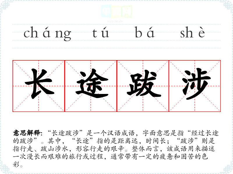 “长途跋涉”给人一种疲惫但又充满成就感的情感反应。它让我联想到许多奋斗的场景,无论是个人的成长还是团队的合作。这个成语提醒我,成功往往伴随着艰辛的付出。
