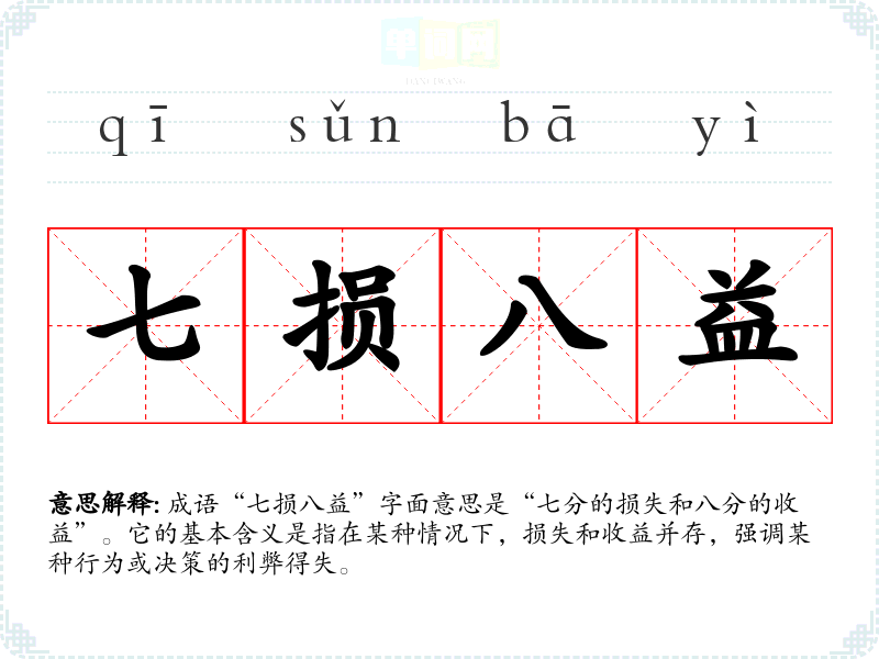 成语“七损八益”字面意思是“七分的损失和八分的收益”。它的基本含义是指在某种情况下,损失和收益并存,强调某种行为或决策的利弊得失。