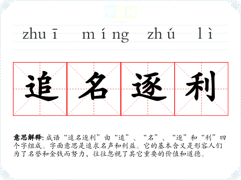 成语“追名逐利”由“追”、“名”、“逐”和“利”四个字组成。字面意思是追求名声和利益。它的基本含义是形容人们为了名誉和金钱而努力,往往忽视了其它重要的价值和道德。