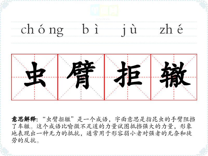 该成语出自《庄子·外物》:“虫臂之所以拒辙者,非不知车之为重也。”这里的“虫臂”指的是昆虫的手臂,表面上看似有力地阻挡车辙,但实际上无济于事。这个典故反映了庄子对生命和力量的深刻理解,强调了微小与强大之间的对比。