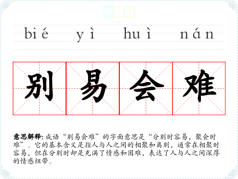 成语“别易会难”的字面意思是“分别时容易,聚会时难”。它的基本含义是指人与人之间的相聚和离别,通常在相聚时容易,但在分别时却是充满了情感和困难,表达了人与人之间深厚的情感纽带。