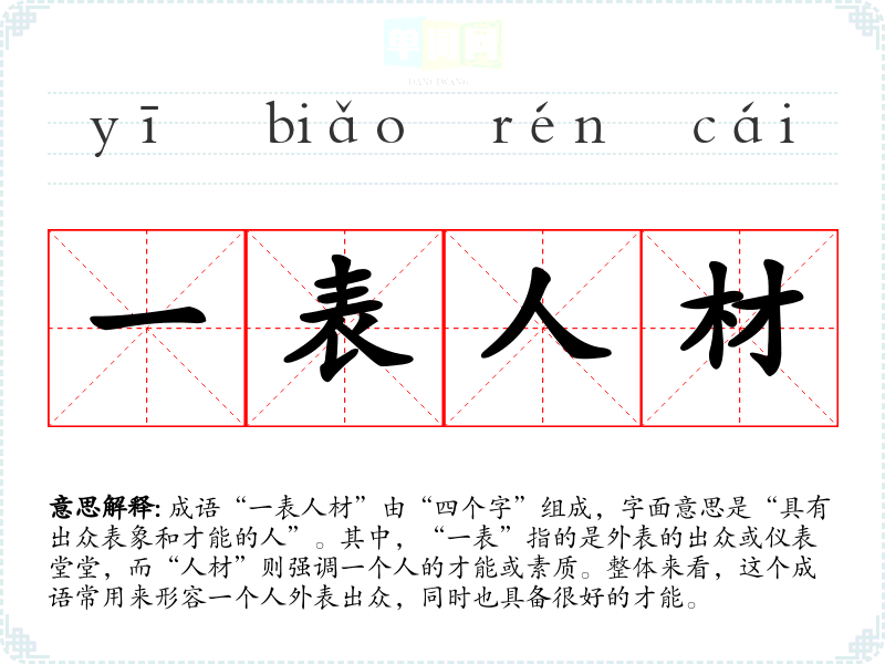 成语“一表人材”由“四个字”组成,字面意思是“具有出众表象和才能的人”。其中,“一表”指的是外表的出众或仪表堂堂,而“人材”则强调一个人的才能或素质。整体来看,这个成语常用来形容一个人外表出众,同时也具备很好的才能。