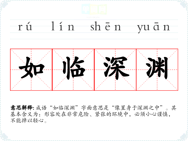 成语“如临深渊”字面意思是“像置身于深渊之中”。其基本含义为:形容处在非常危险、紧张的环境中,必须小心谨慎,不能掉以轻心。