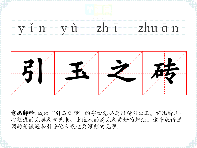成语“引玉之砖”的字面意思是用砖引出玉。它比喻用一些粗浅的见解或意见来引出他人的高见或更好的想法。这个成语强调的是谦逊和引导他人表达更深刻的见解。