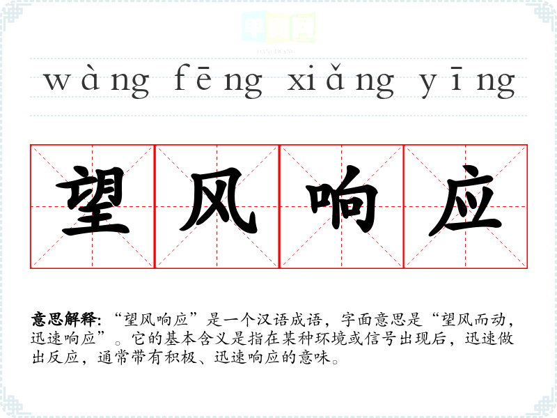 “望风响应”是一个汉语成语,字面意思是“望风而动,迅速响应”。它的基本含义是指在某种环境或信号出现后,迅速做出反应,通常带有积极、迅速响应的意味。