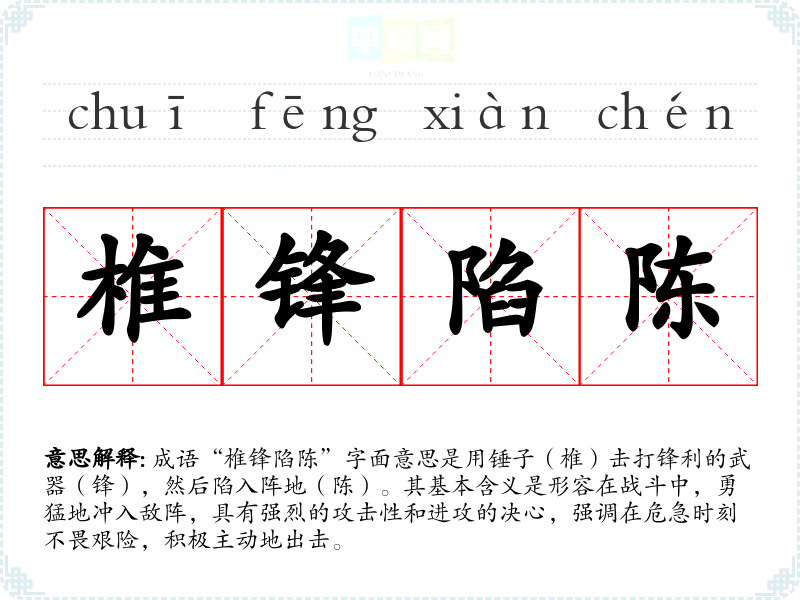 成语“椎锋陷陈”字面意思是用锤子(椎)击打锋利的武器(锋),然后陷入阵地(陈)。其基本含义是形容在战斗中,勇猛地冲入敌阵,具有强烈的攻击性和进攻的决心,强调在危急时刻不畏艰险,积极主动地出击。