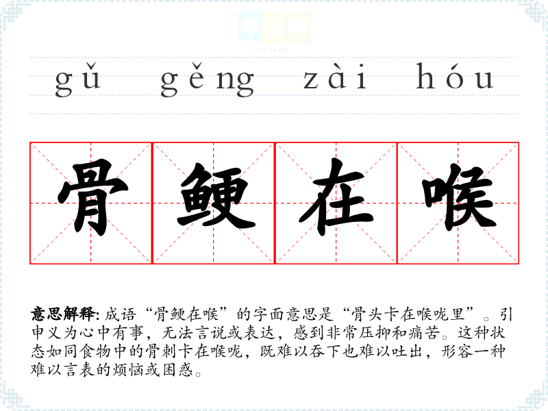 成语“骨鲠在喉”的字面意思是“骨头卡在喉咙里”。引申义为心中有事,无法言说或表达,感到非常压抑和痛苦。这种状态如同食物中的骨刺卡在喉咙,既难以吞下也难以吐出,形容一种难以言表的烦恼或困惑。