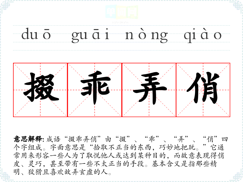 成语“掇乖弄俏”由“掇”、“乖”、“弄”、“俏”四个字组成。字面意思是“拾取不正当的东西,巧妙地把玩。”它通常用来形容一些人为了取悦他人或达到某种目的,而故意表现得俏皮、灵巧,甚至带有一些不太正当的手段。基本含义是指那些精明、狡猾且喜欢故弄玄虚的人。