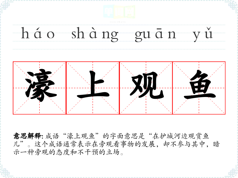 成语“濠上观鱼”的字面意思是“在护城河边观赏鱼儿”。这个成语通常表示在旁观看事物的发展,却不参与其中,暗示一种旁观的态度和不干预的立场。