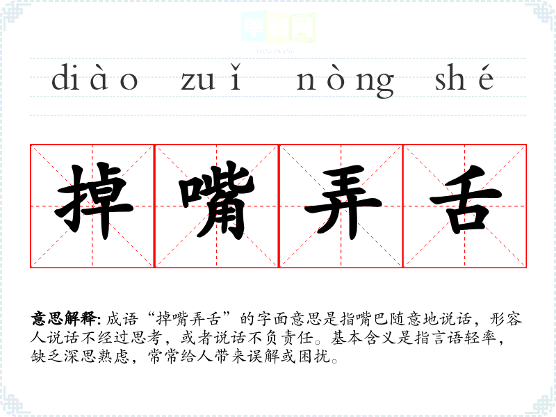 成语“掉嘴弄舌”的字面意思是指嘴巴随意地说话,形容人说话不经过思考,或者说话不负责任。基本含义是指言语轻率,缺乏深思熟虑,常常给人带来误解或困扰。