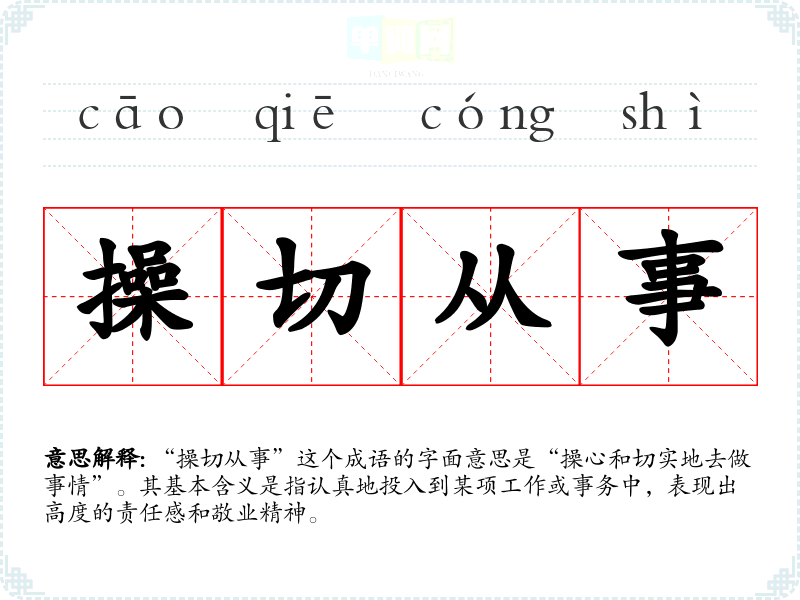 “操切从事”这个成语的字面意思是“操心和切实地去做事情”。其基本含义是指认真地投入到某项工作或事务中,表现出高度的责任感和敬业精神。