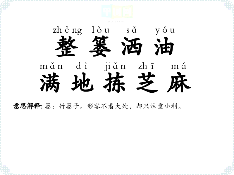 | 整篓洒油,满地拣芝麻 | 篓:竹篓子。形容不看大处,却只注重小利。 |