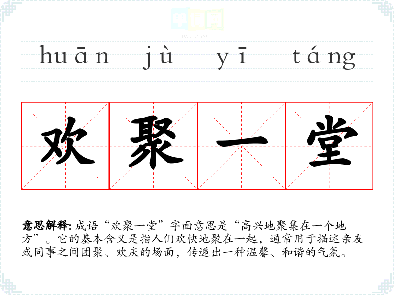 成语“欢聚一堂”字面意思是“高兴地聚集在一个地方”。它的基本含义是指人们欢快地聚在一起,通常用于描述亲友或同事之间团聚、欢庆的场面,传递出一种温馨、和谐的气氛。