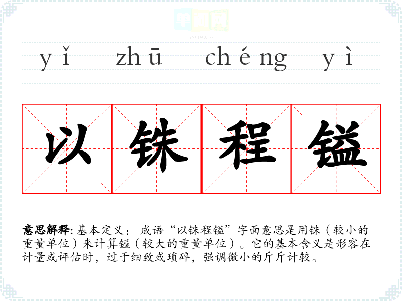 基本定义: 成语“以铢程镒”字面意思是用铢(较小的重量单位)来计算镒(较大的重量单位)。它的基本含义是形容在计量或评估时,过于细致或琐碎,强调微小的斤斤计较。