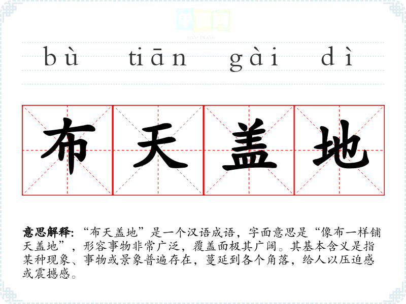 “布天盖地”是一个汉语成语,字面意思是“像布一样铺天盖地”,形容事物非常广泛,覆盖面极其广阔。其基本含义是指某种现象、事物或景象普遍存在,蔓延到各个角落,给人以压迫感或震撼感。